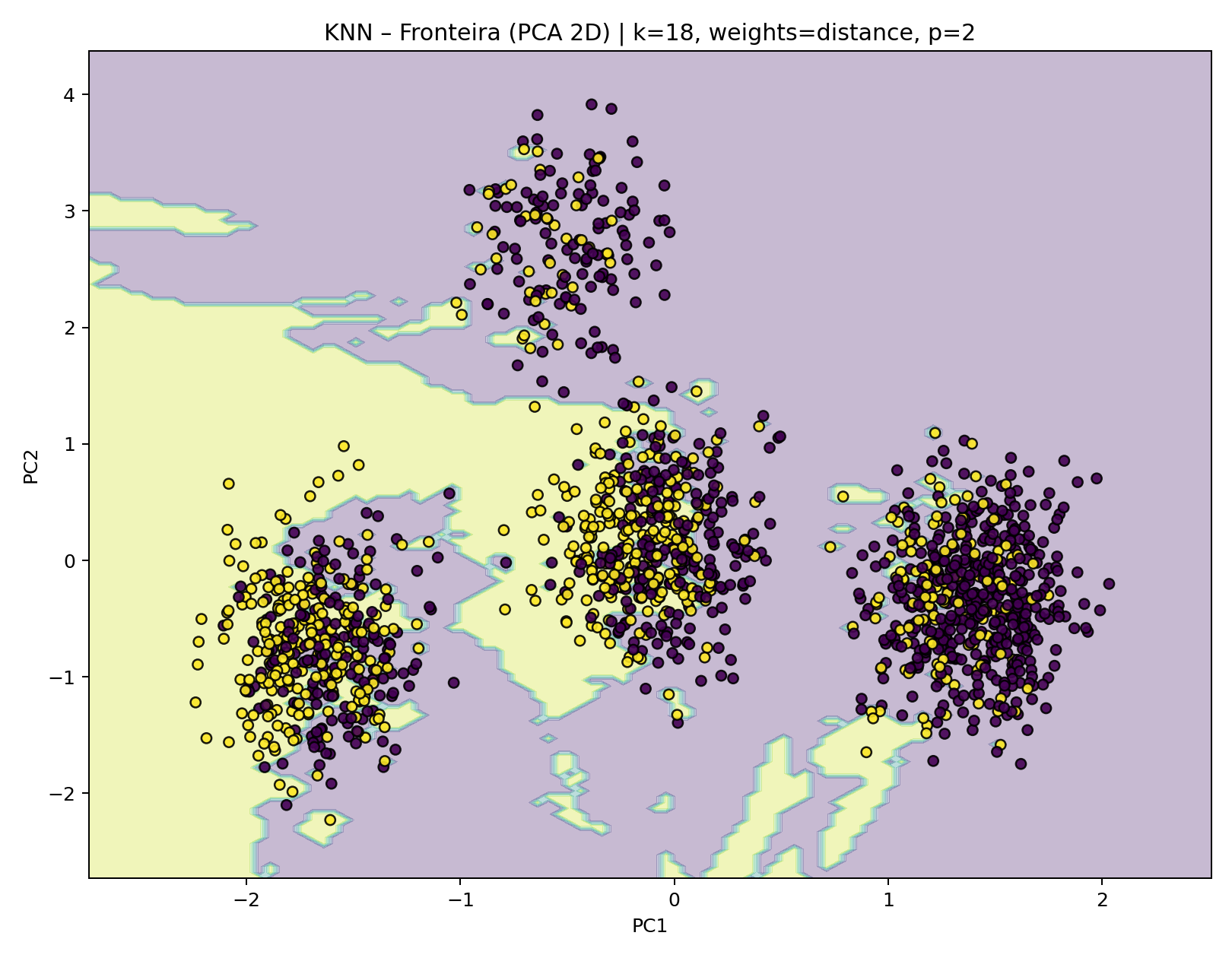 - Resultados: KNN com (k=18, weights='distance', p=2) apresenta acurácia ~75% e métricas macro ~0.74.