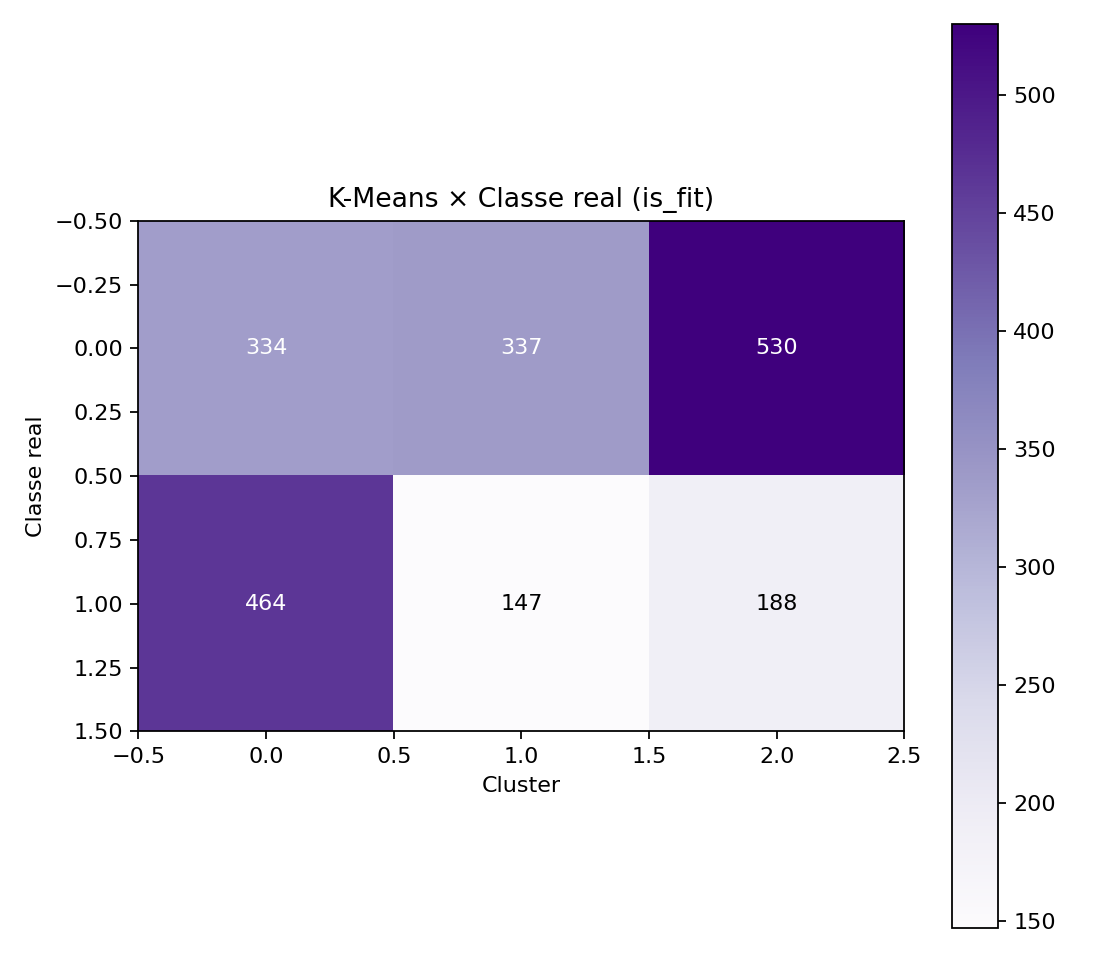 ) e sofre levemente com falsos negativos. - O K-Means reforça padrões similares, mas sem a mesma separabilidade de fronteiras.