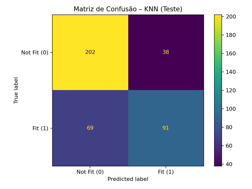 alcançou acurácia ~75% e AUC 0.80, sendo um classificador eficaz para estimar a condição física (is_fit